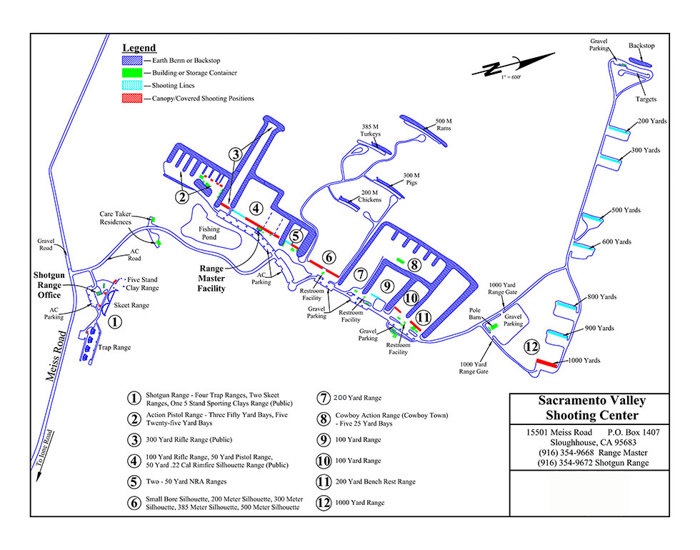 Looking for shooting ranges in Sacramento? The Sacramento Valley Shooting Center is home to 13 distinct ranges spread across 860+ acres. Each range is built for a specific purpose, and knowing which one fits your goal for the day makes for a better trip. Some are open to the public, others are reserved for members, and some are only available only to affiliated clubs and vendors running scheduled events. Distances, allowed calibers, and permitted activities vary from range to range, so it’s worth a quick look before you head out. Use the map to get oriented, then browse the range details below for hours, access, and what each one is set up to handle.